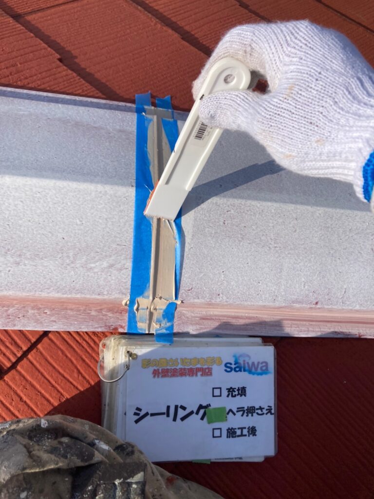棟板金のつなぎ目部分にシーリングを充填します。