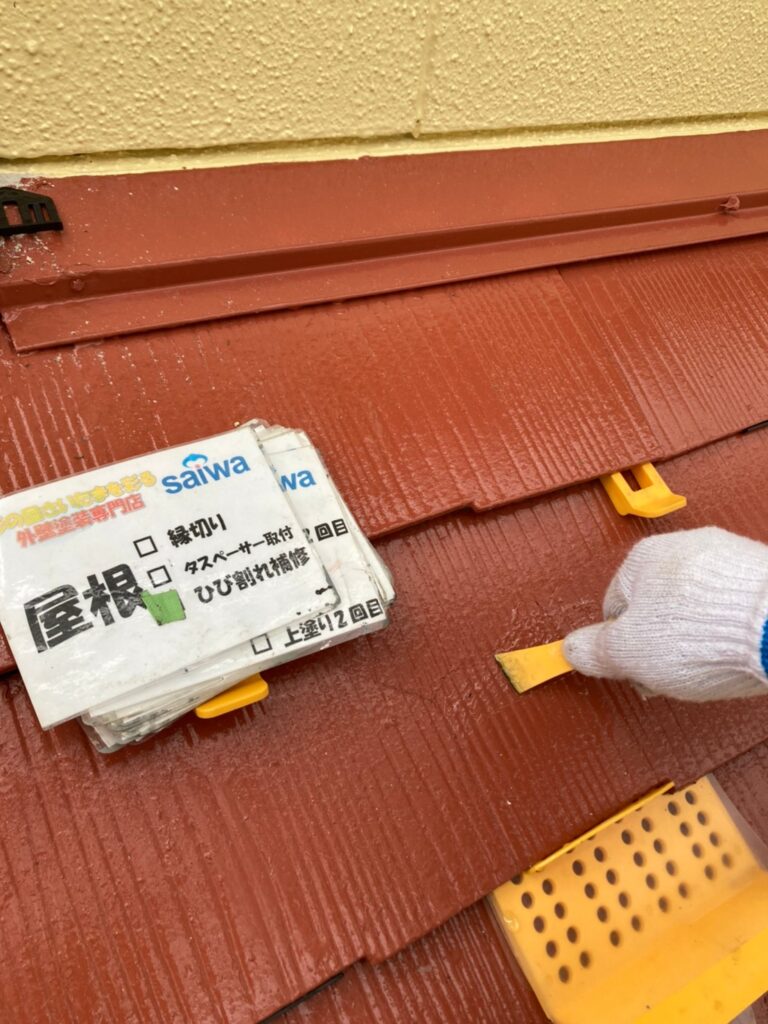 屋根塗装前にひび割れが数カ所確認できましたので、タスマジックを使い屋根の割れを補修させていただきました。
