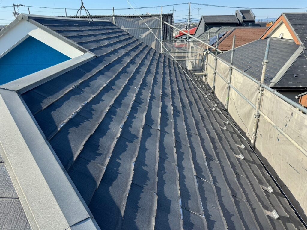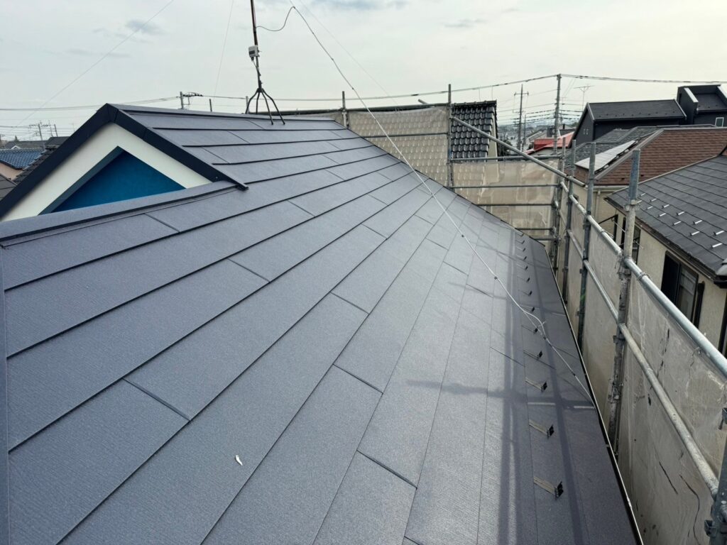 屋根には、耐久性と断熱性に優れた金属屋根材【スーパーガルテクト】を使用。既存の屋根の上に新しい屋根を重ねる「カバー工法」で施工しました。
