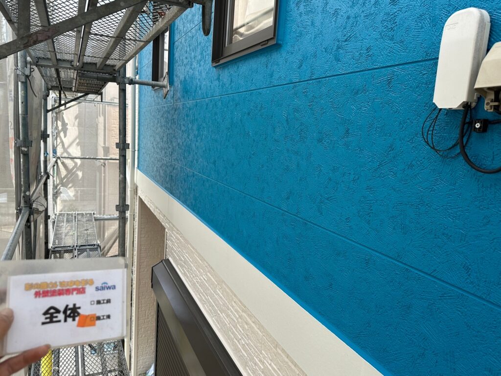 「シェイドブルー」の色味で、外壁の青とも調和し、統一感のある美しい仕上がりになりました。