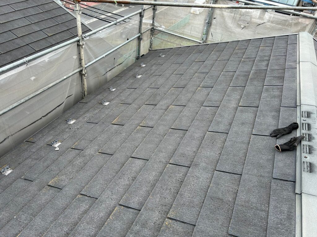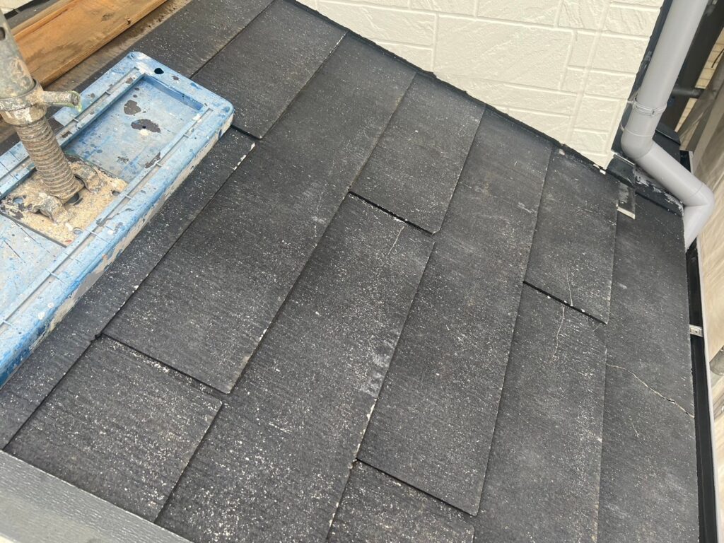 屋根材はグリシェイドNEOで、ズレや割れ、欠けが確認され、表面の塗膜も劣化して防水性能がほとんど失われていました。