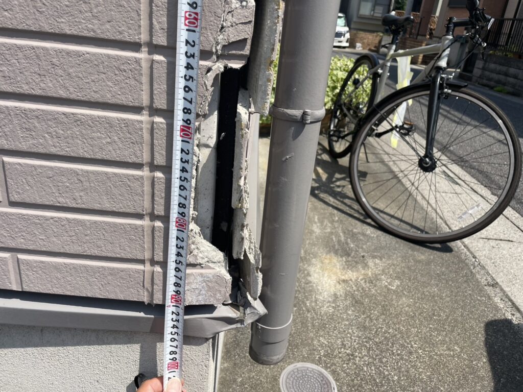 確認すると、外壁は大きく剥がれ、水切りは歪み、雨樋の下部が外れた状態でした。一部の損傷ではありましたが、目立つ位置にあったため外観への影響も大きく、早めの補修をご希望されていました。