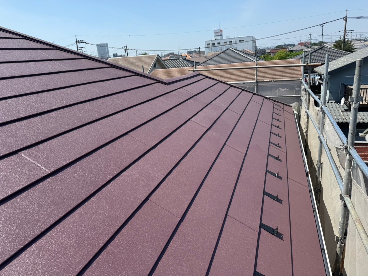 仕上がりのカラーである「シェイドワインレッド」は深みのある落ち着いた赤色で、金属屋根のシャープさを活かしながら上品さを演出してくれます。K様邸でも外観に馴染む色味で、美観と機能性の両方を高めるリフォームとなりました。