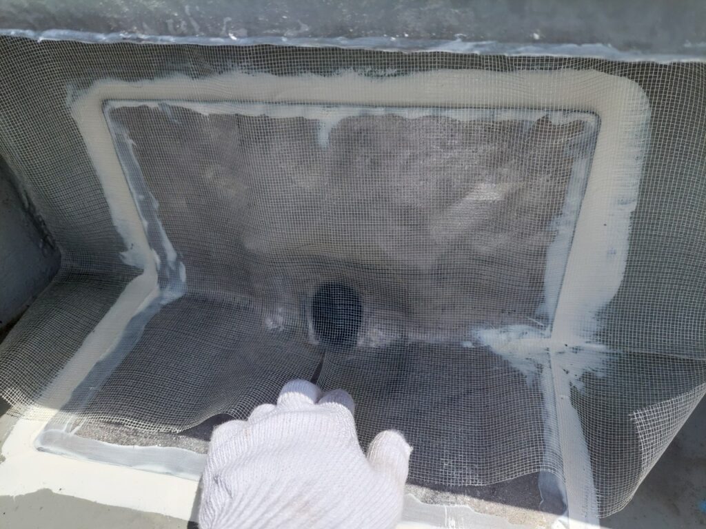 防水層の補強としてメッシュシートを貼り付ける工程|高品質なウレタン防水施工事例