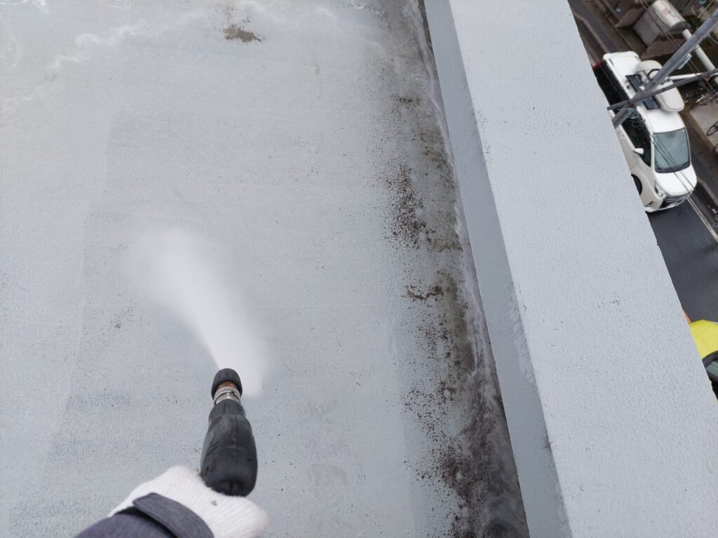 屋上の汚れや旧防水材を高圧洗浄でしっかり落とし、ウレタン防水の密着性を高める下地処理作業