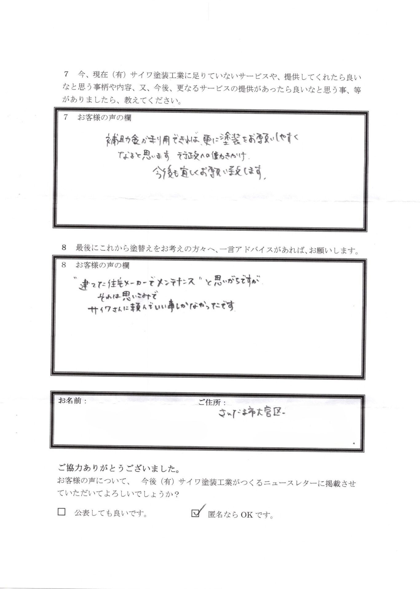 【⑦今、現在(有)サイワ塗装工業に足りていないサービスや、提供してくれたら良いなと思う事柄や内容、又、今後、更なるサービスの提供があったら良いなと思う事、等がありましたら、教えてください。】