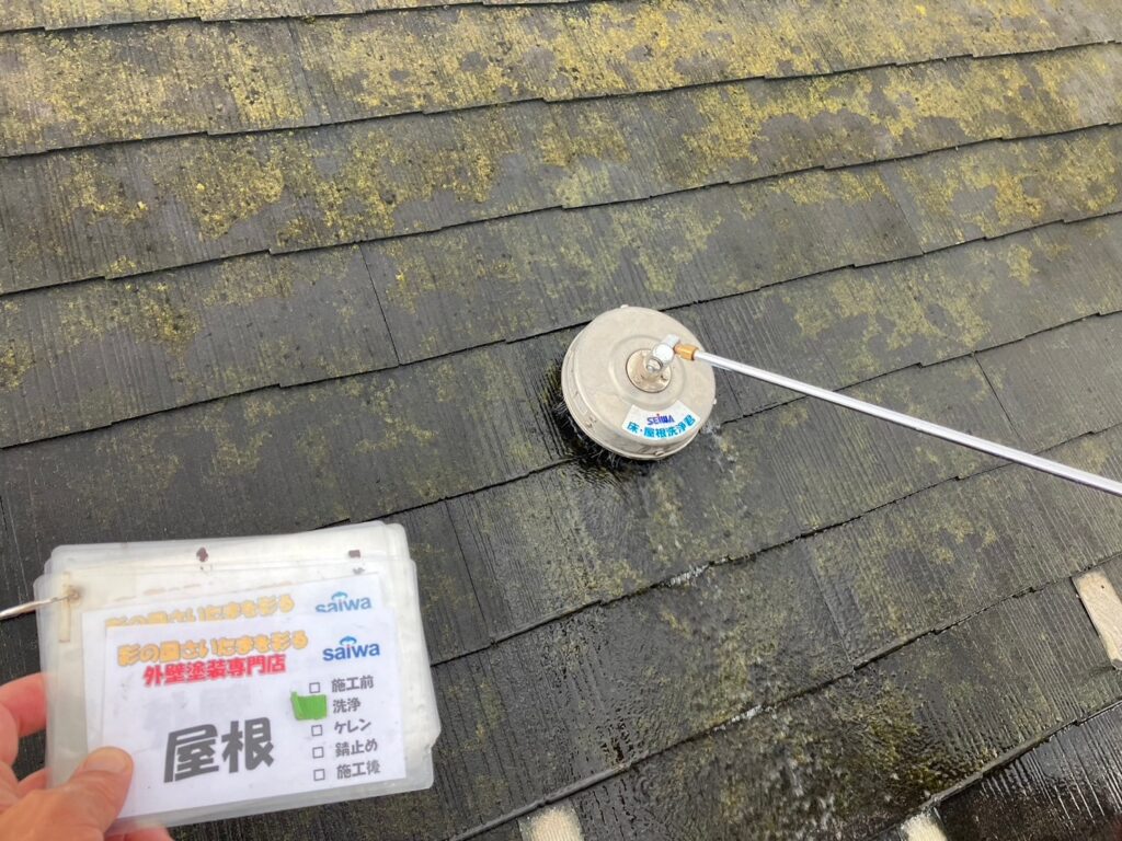屋根塗装前に苔や汚れを除去する高圧洗浄作業 さいたま市大宮区の屋根塗装施工事例