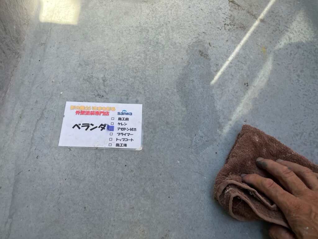 ベランダ防水トップコート前のアセトン拭き作業 密着性向上工程 さいたま市