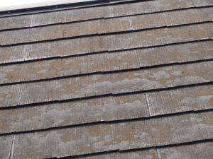 屋根全体に色褪せが進み、防水性が低下している状態でした。さらに、湿気の影響で藻が発生しており、塗り替えのタイミングとして適切な状態でした。