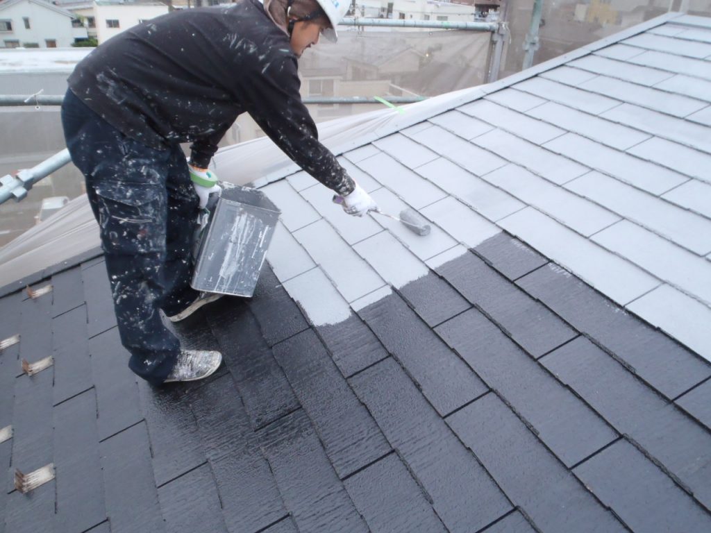 屋根全体に下塗り材をローラーで塗布します。劣化で傷んだ屋根材にたっぷりと吸い込ませるように塗るのがポイントです。