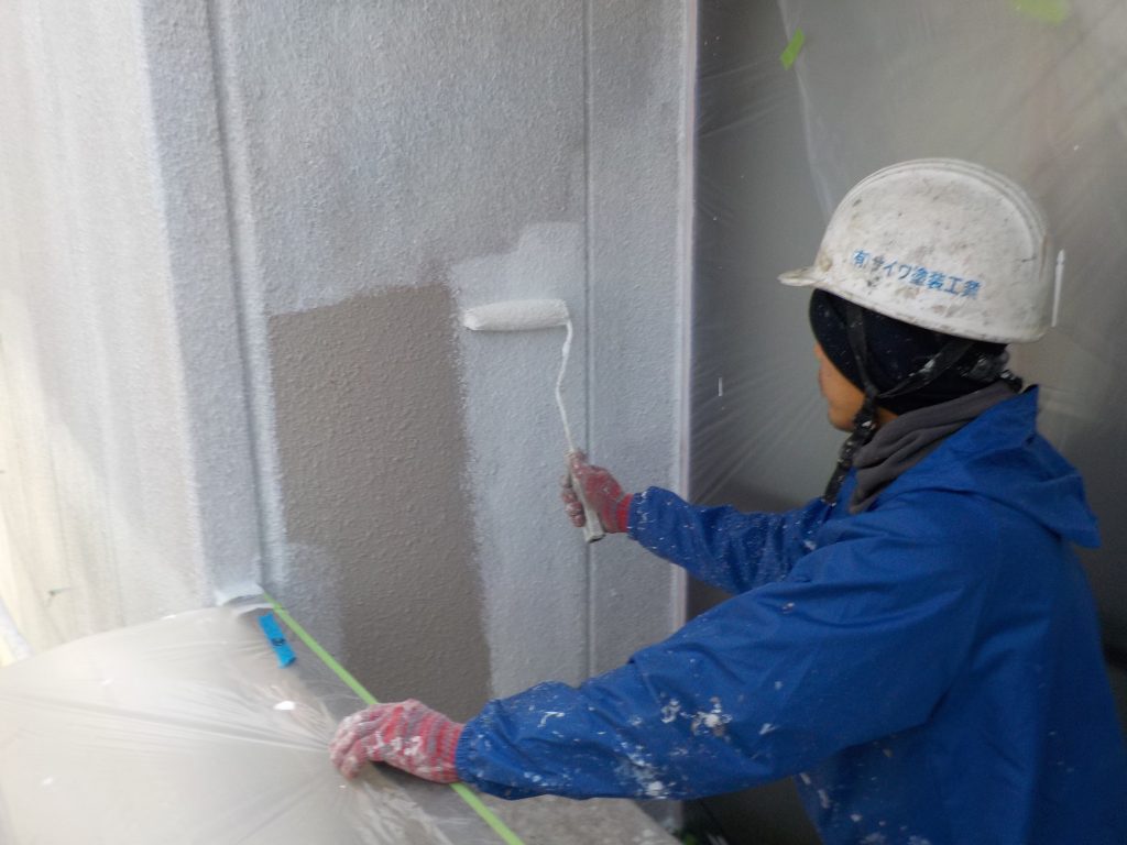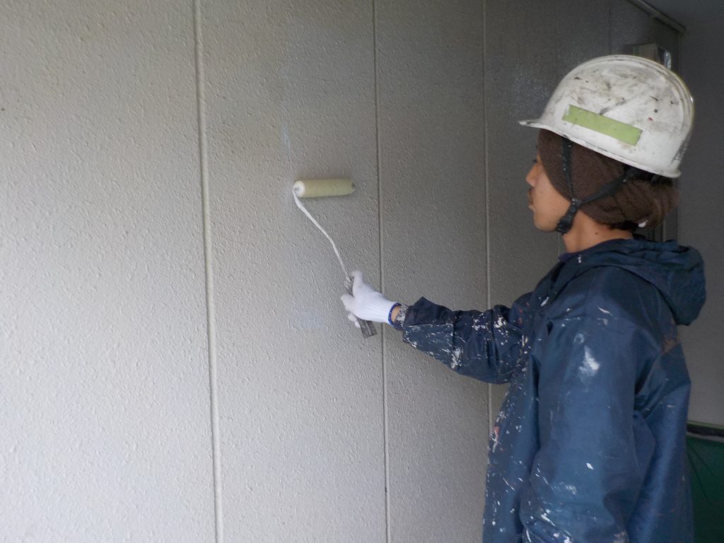 ローラーで下塗り材を塗布します。しっかりと塗装が密着するように下塗りは大事な作業です。