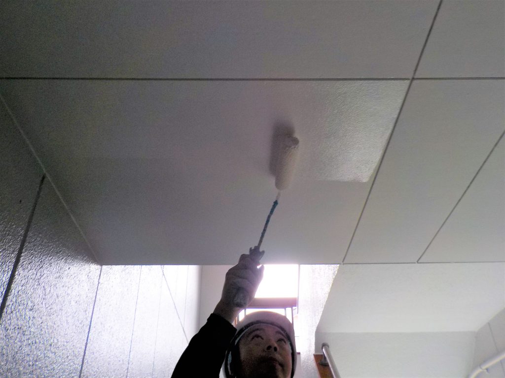 天井の下塗りです。次に塗る塗料の密着を高めます。